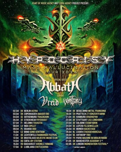 - Peter Tägtgrens HYPOCRISY kündigt für den April seine große “Mass Hallucination“ Europatour, (inklusive UK ) mit Black Metal Meister ABBATH als Special Guest sowie den Death Metallern VOMITORY und den norwegischen VREID. Tickets für die Tour gibt es ab dem… –weiterlesen–