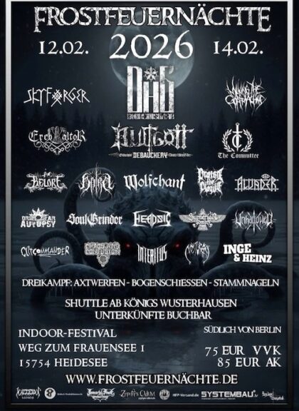 - Brandenburgs Heidesee bei Berlin ist der Austragungsort der Frostfeuernächte vom 12.-14. Februar 2026, Für das dreitägige Indoorfestival haben die Macher jede Menge Bands der Black, Death und Extreme-Szene eingeladen. Darunter befinden sich Acts wie DØDHEIMSGARD, BLUTGOTT (Debauchery Oldschool Set), EREB… –weiterlesen–