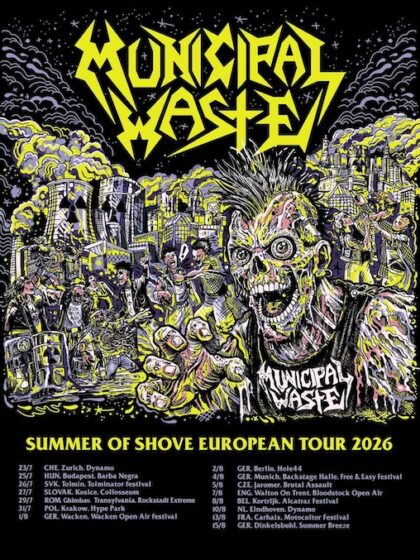 - MUNICIPAL WASTE haben ihre europäischen Termine für den anstehenden Sommer unter dem Banner “Summer Of Shove“ European Tour 2026 gebündelt: Wie üblich sind dabei Festivaltermine und Clubshows miteinander verwoben. Bei den Clubshows in Deutschland werden Battlecreek den Support unternehmen. Hier… –weiterlesen–