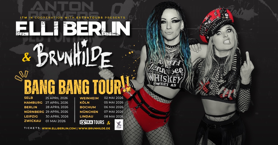 ELLI BERLIN und BRUNHILDE, die modernen Rockerinnen und ihre Bands, gehen ab Ende April auf gemeinsame Tour. Passend dazu ist jetzt die Kollabrationssingle `Bang Bang` erschienen, zu der ihr hier das Video sehen könnt. Die Tourdaten seht ihr unten auf dem Flyer.