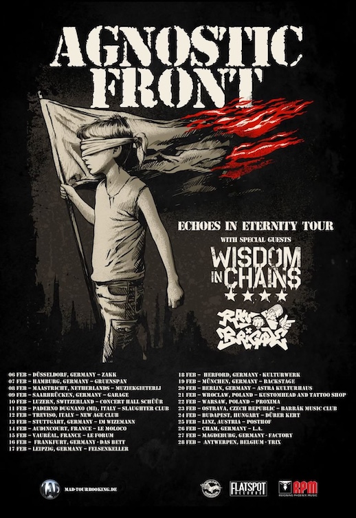 Die New Yorker Hardcore Punk Institution AGNOSTIC FRONT kündigt für denFebruar 2026 ihre `Echoes In Eternity` Tour durch Europa an, mit der sie das neue Album dann auch bei uns live vorstellen. Begleitet werden AGNOSTIC FRONT dabei von Wisdom In Chains und Raw Brigade. Wer also wieder mal Bock auf derben Punk und Tracks wie `For My Family` , ` Old New York` oder `Gotta Go` hat, bekommt genug Gelegnheit sich auszutoben.