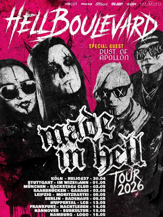 Im April und Mai sind die in Deutschland und der Schweiz beheimateten Goth ´n´ Roller HELL BOULEVARD wieder „on the road“ unterwegs und gehen auf „MADE IN HELL Tour 2026“. Dann mit dem gleichnamigen neuen Longplayer im Gepäck, der am 24. April auf den Markt kommt. Als Support Act ist der Berliner Produzent, Sänger und Songwriter DUST OF APOLLON am Start.