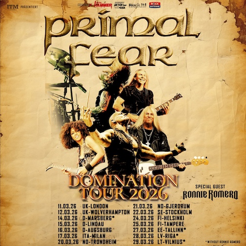 PRIMAL FEAR geben die Verlängerung ihrer “Domination“ Europa Tour für 2026 bekannt. Inzwischen sind einige neue europäische Termine im März dazu gekommen veröffentlicht. Neu ist auch, dass RONNIE ROMERO als Special Guest für Deutschland bestätigt ist.