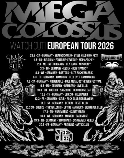 - 28. Februar – 20. März 2026MEGA COLOSSUS, die 2005 gegründete US Heavy Metal Truppe aus North Carolina mit Fun-Faktor, plant die Veröffentlichung ihrer “Watch Out“ Full-Length Scheibe am 26 März. Dazu passend hat die Band die Termine ihrer “Watch Out“ European Tour online gestellt, die sie auch nach Deutschland führt. Die Termine seht ihr auf dem Flyer Mehr von MEGA COLOSSUS –weiterlesen–