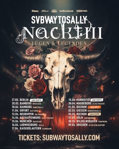 - 27. März – 18. April 2026Unter dem Motto ”NACKT III – Lügen & Legenden“ haben SUBWAY TO SALLY ihre Tourpläne für das kommende Frühjahr vorgestellt. Wer Eric und seine seit über drei Jahrzehnten umtriebige und erfolgreiche Folk, Medival, Metal Band wieder live sehen möchte, kann das, mit Unterbrechungen, in reichlich deutschen Hallen tun. Hier die Livetermine für 2026: 27.03.2026 – Berlin 28.03.2026 – Bamberg… –weiterlesen–