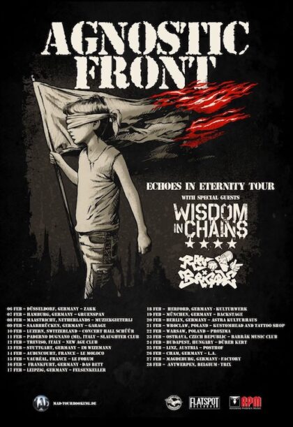 - 6. Februar – 27. Februar 2026Die New Yorker Hardcore Punk Institution AGNOSTIC FRONT kündigt für denFebruar 2026 ihre `Echoes In Eternity` Tour durch Europa an, mit der sie das neue Album dann auch bei uns live vorstellen. Begleitet werden AGNOSTIC FRONT dabei von Wisdom In Chains und Raw Brigade. Wer also wieder mal Bock auf derben Punk und Tracks wie `For My Family` , `… –weiterlesen–