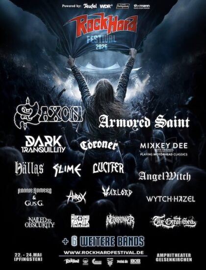 - 22. Mai – 24. Mai 2026Amphitheater GelsenkirchenDas alteingesessene Rock Hard Festival gibt weitere Bands für seine nächste Ausgabe , am 22.-24. Mai 2026, bekannt. So sind heute weitere fünf Acts bekannt für die traditionelle Pfingstveransataltung gegeben worden: SAXON, WARLORD, HÄLLAS, THE NEPTUNE POWER FEDERATION und THE GREAT SEA. Somit verbleiben noch sechs weitere Plätze im Billing 2026. Das Line-Up 2026 sieht entsprechend bisher so aus: SAXON… –weiterlesen–
