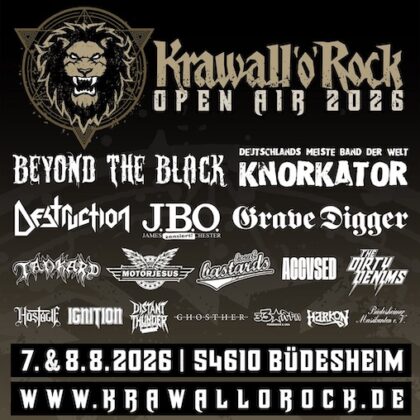 - 7. August – 8. August 2026Festivalgelände BüdesheimDas Krawall’o’Rock Open Air erweitert sein Billing für 2026. So haben die Macher gerade BEYOND THE BLACK als Headliner für die nächste Ausgabe vom 07. und 08. August bekannt gegeben. Daneben sind bereits JBO, DESTRUCTION, GRAVE DIGGER, KNORKATOR, TANKARD, ACCVSED, MOTÖRJESUS, THE DIRTY DENIMS, IGNITION, DISTANT THUNDER, HOSTAGE sowie die LOCAL BASTARDS geplant. Weitere Acts für die Veranstaltung in Büdesheim… –weiterlesen–