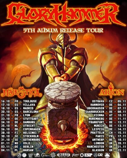 - 23. Oktober – 15. November 2026GLORYHAMMER, die Power Metaller “from Space“ planen für den Herbst 2026 ihre Europatour zum nächsten, bisher noch unbetitelten Longplayer. Sicher ist schon, dass MAJESTICA und ARION dabei sein werden, um die Power Metal Anhänger zu begeistern. GLORYHAMMER schreiben auf ihren Social Media Kanälen: “MIGHTY WARRIORS, READY YOUR HAMMERS! Next year we’ll be returning to Europe for a GIGANTIC TOUR across… –weiterlesen–