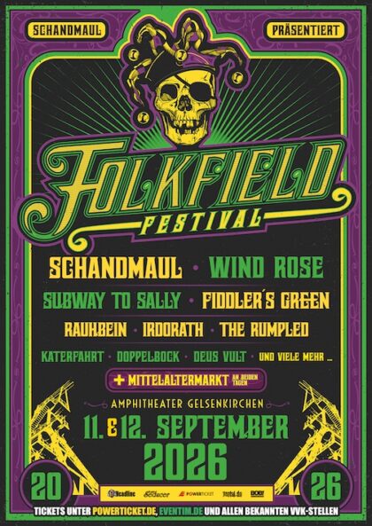 - 11. September – 12. September 2026Amphitheater GelsenkirchenDas Folk, Mittelalter und Metal verbindende Folkfield Festival geht im September 2026 zum vierten Mal im Gelsenkirchener Amphitheater über die Runden. Wie immer als Headliner sind SCHANDMAUL als Headliner dabei., Außerdem sind SUBWAY TO SALLY, die Power Metaller von WIND ROSE, RAUHBEIN, FIDDLER’S GREEN, DOPPELBOCK, IRDORATH, KATERFAHRT, THE RUMPLED, DEUS VULT sowie weitere, noch nicht genannte Acts für den 11…. –weiterlesen–