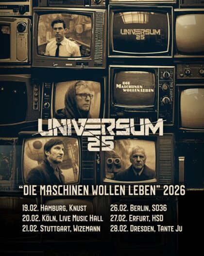 - 19. Februar – 28. Februar 2026Die deutsche Rock, Punk und Metal Supergroup bestehend aus Robert Rhein (In Extremo), Rupert Keplinger (Eisbrecher, Antitype), Pat Prziwara (Fiddler’s Green), Gunnar Schroeder (Dritte Wahl) und Alex Schwers (Slime) stellt am 20. Februar ihr gemeinsames Zweitwerk „Die Maschinen wollen leben“ vor. Parallel zum Release geht es auf eine kurze Tour zum Album. „DIE MASCHINEN WOLLEN LEBEN“-Tour: 19.02.26 Hamburg, Knust 20.02.26… –weiterlesen–