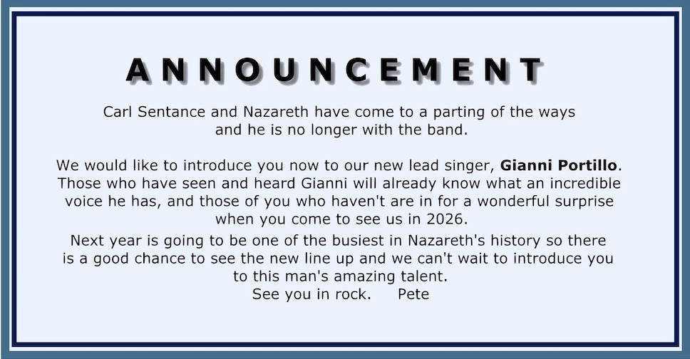 Die Rocker von NAZARETH haben, nach Beendigung der “Bending The Rules“ Tour, bekannt gegeben, dass der von VICTORY bekannte Sänger Gianni Pontillo ab sofort ihren bisherigen Frontmann Carl Sentence ersetzt, der zehn Jahre die Position inne hatte. NAZARETHs Statement zum Sängerwechsel findet ihr unten.