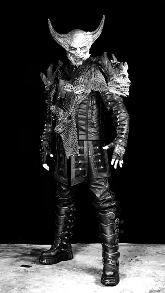 Auf dem “Legions of Metal” Cover ist so ein Viech, ein Trinity Blood God. Das Kreuz um den Hals zeigt seine Zugehörigkeit zu den Balgeroth Legionen. Der Chaosstern seine Verehrung von Dracul Drakorgoth, dem Debauchery Blood God. Seine rote Färbung soll seine Zugehörigkeit zu Setekh Drakorgaur, dem BLUTGOTT der Tiere, symbolisieren. An seiner Rüstung hängen die Überreste einiger Menschen, an seinem Gürtel Kinderschädel und im Hintergrund sieht man ein Dorf brennen.